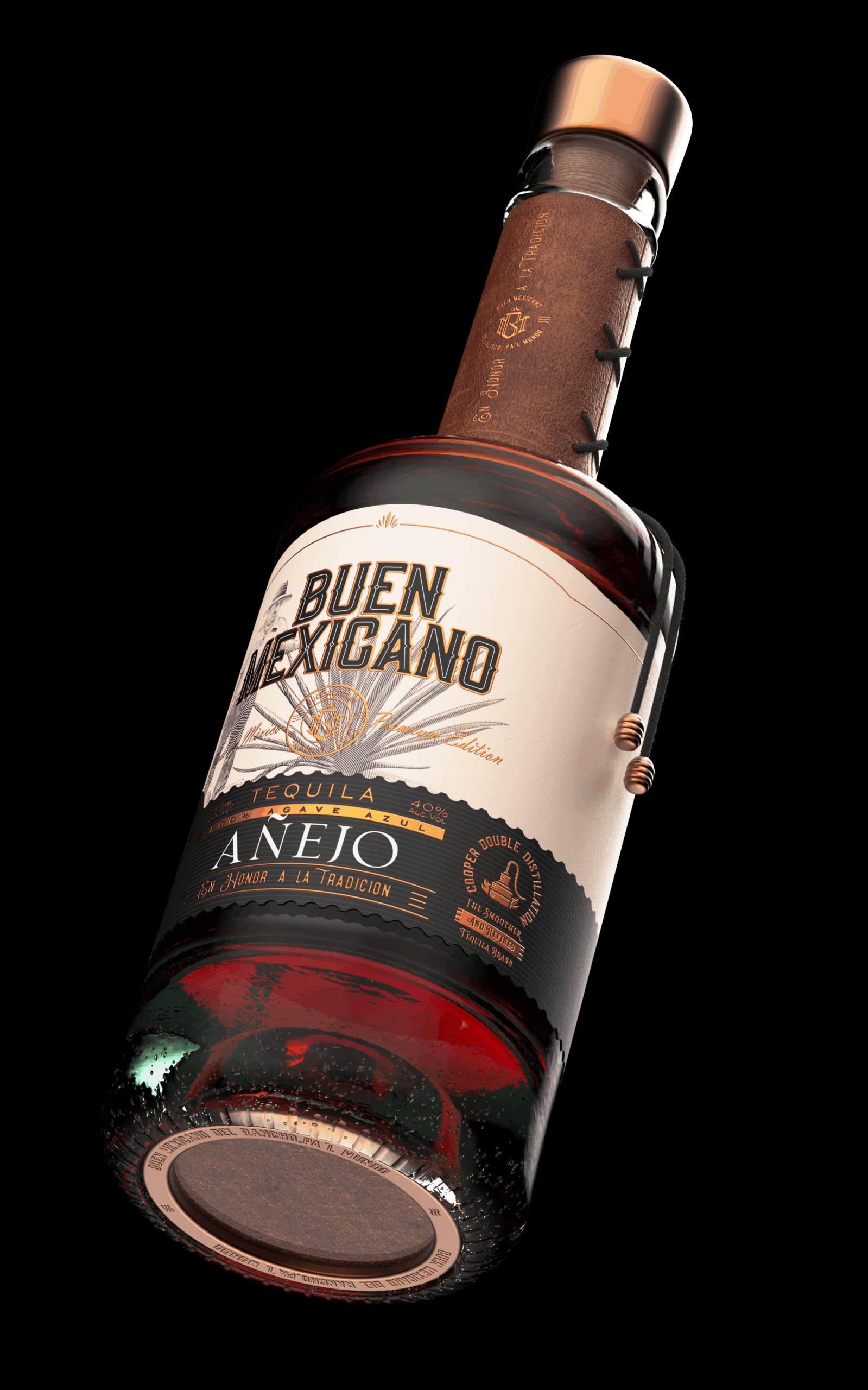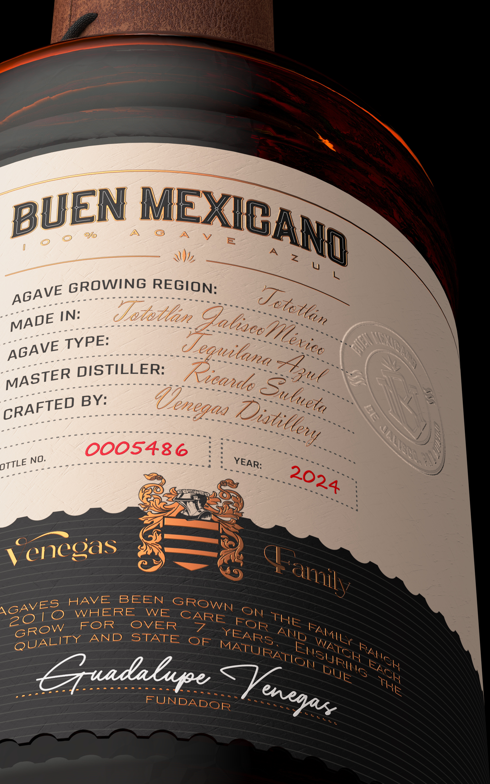 El escudo familiar presente en el reverso de la etiqueta añade una capa de profundidad histórica. Representa la unión entre legado y visión moderna, haciendo de Buen Mexicano una marca que no solo produce tequila, sino que cuenta una historia que se hereda.